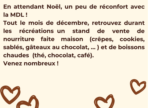 Une douce pause gourmande pour patienter jusqu’à Noël Du 2 au 20 décembre 2024, la Maison des Lycéens (MDL) vous invite à son stand « MDL Café », organisé pendant les récréations. Ce moment chaleureux est l’occasion de déguster des gourmandises faites maison et des boissons chaudes dans une ambiance […]
