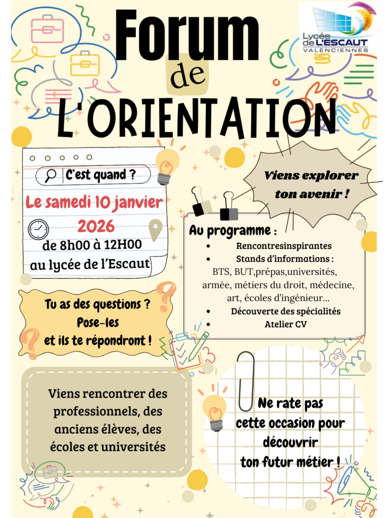 Valenciennes – Le samedi 10 janvier 2026, de 8h00 à 12h00, le Lycée de l’Escaut se transformera en un véritable carrefour des possibles à l’occasion de son traditionnel Forum de l’Orientation et des Métiers.