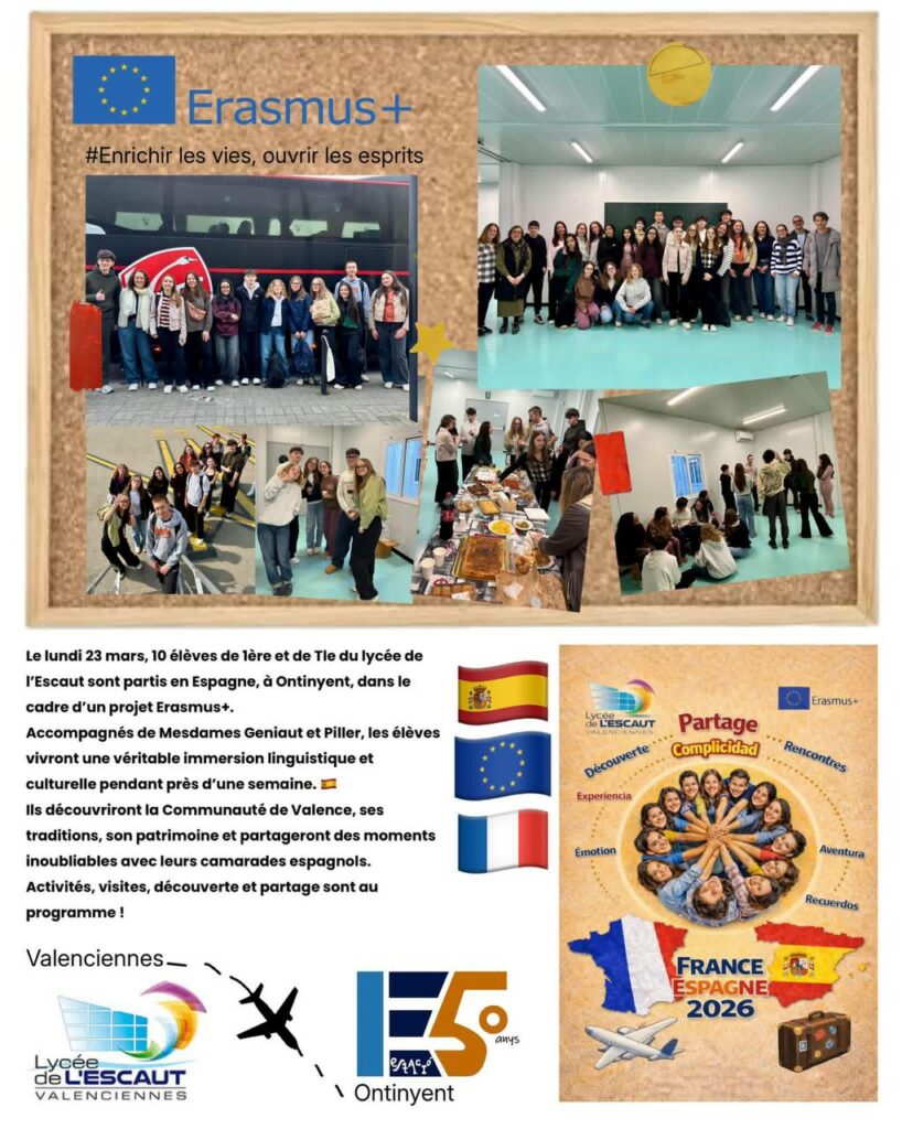 Dans le cadre d’un projet Erasmus+, dix élèves de première et de terminale du lycée de l’Escaut ont séjourné une semaine en Espagne, dans la Communauté de Valence, au sein de la ville d’Ontinyent. Accompagnés par deux enseignantes, ils ont été accueillis par leurs correspondants espagnols et ont bénéficié d’un programme riche, alternant découvertes culturelles et temps de travail au lycée partenaire.