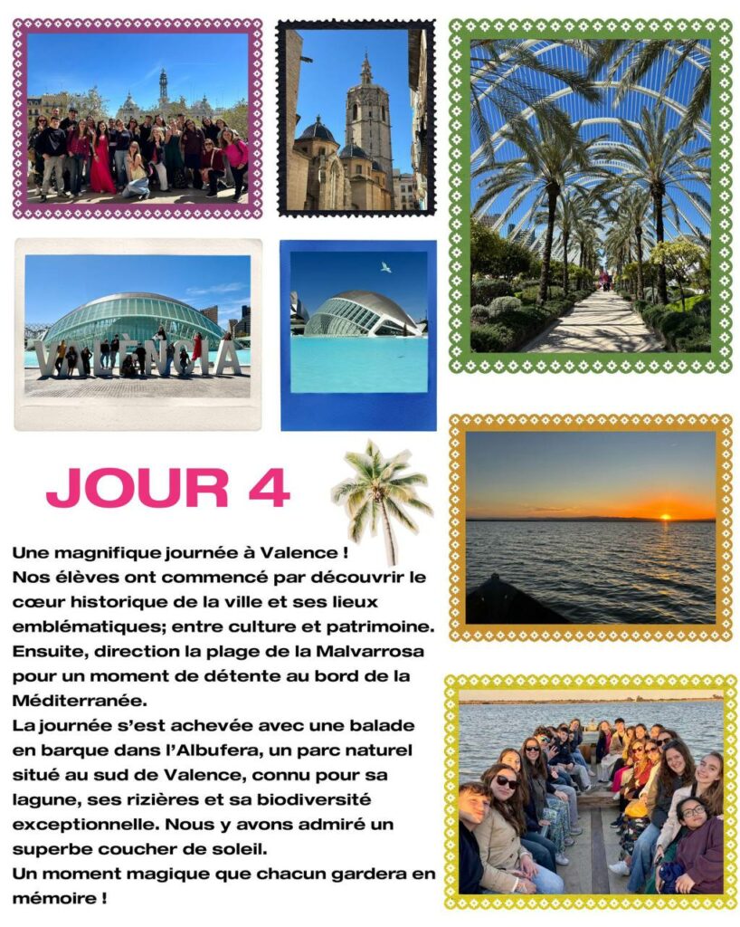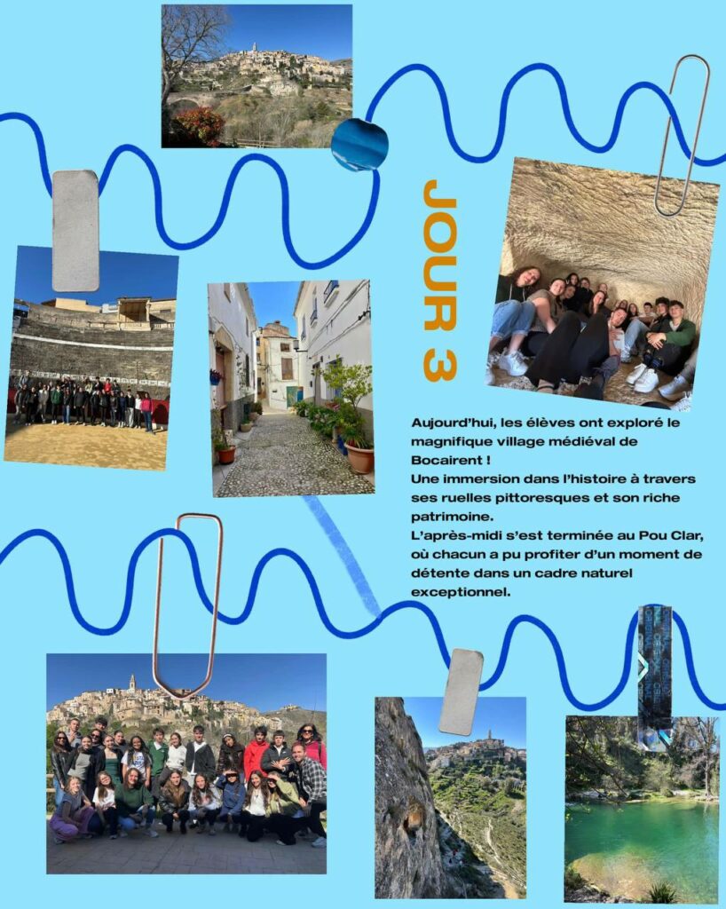 Le programme s’est poursuivi avec une journée à Bocairent, village médiéval, où les élèves ont exploré les ruelles pittoresques et le patrimoine historique, avant de profiter d’un temps de détente en pleine nature au Pou Clar. Une journée à Valence a ensuite permis de découvrir le centre historique, la Cité des Arts et des Sciences, la plage de la Malvarrosa et le parc naturel de l’Albufera, avec une balade en barque au coucher du soleil.