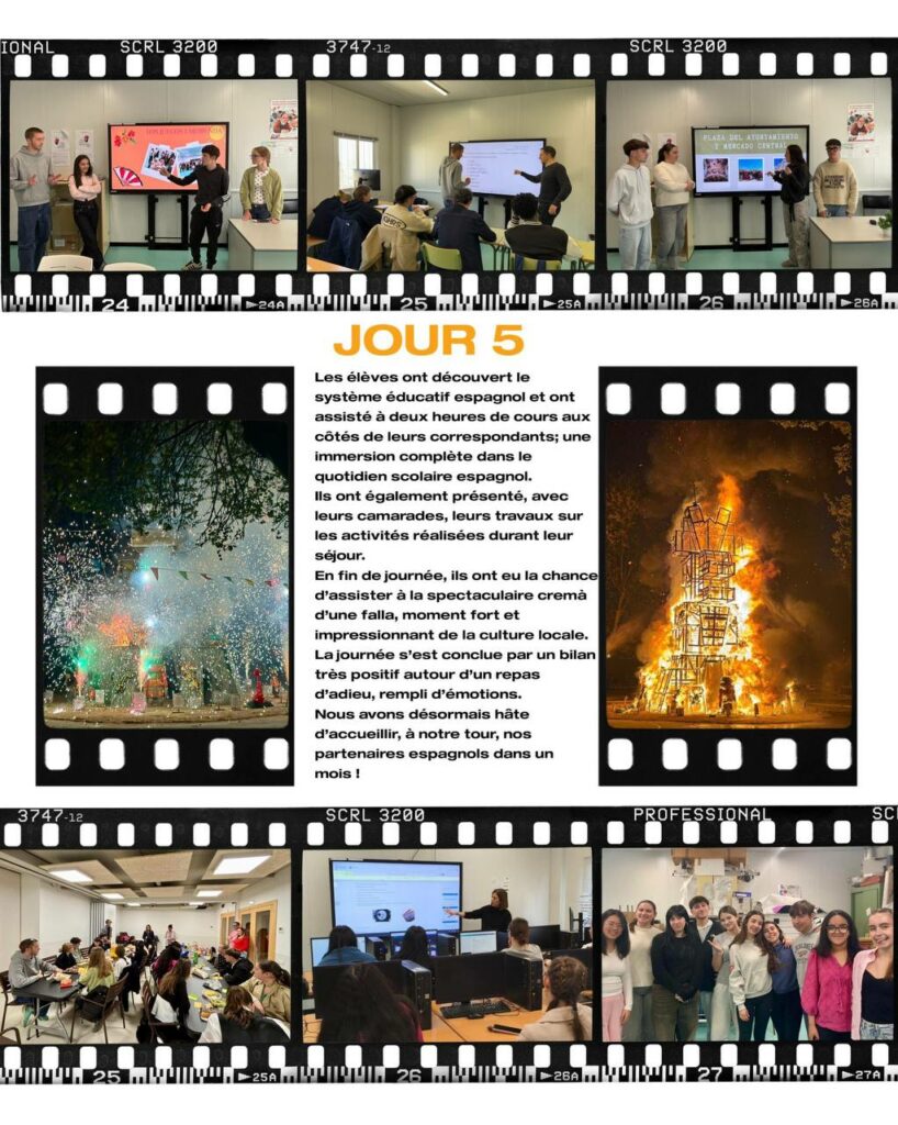 Sur le volet scolaire, les élèves ont assisté à des cours, présenté leurs travaux communs et échangé avec leurs correspondants sur les différences entre les systèmes éducatifs français et espagnol. Ils ont également pu assister à une crémà de falla, moment emblématique de la culture locale.